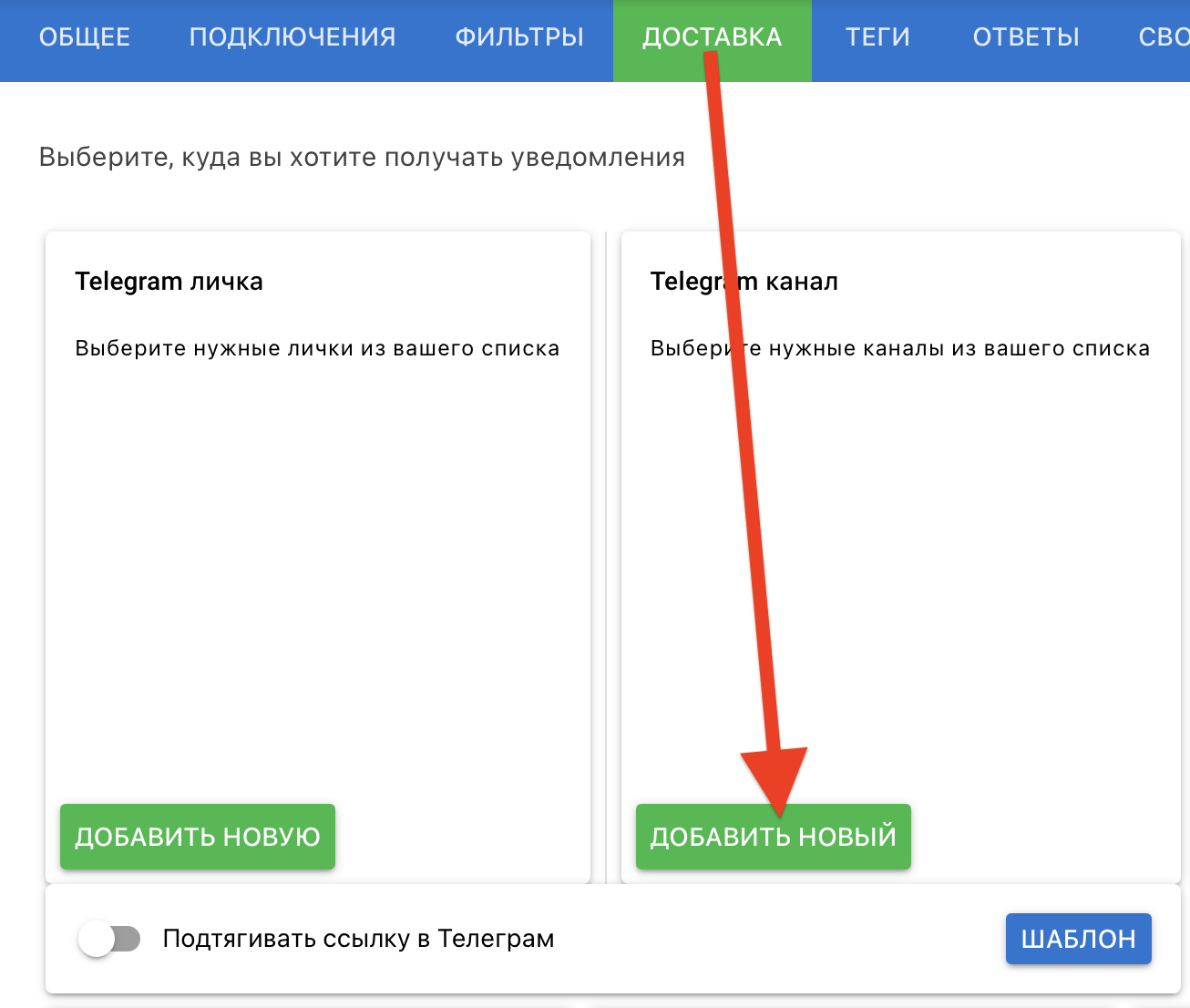 Шаг 2 - перейдите на вкладку Доставка. Вы увидите возможности подключить разнообразные способы доставки/пересылки. Кликните в секции "Телеграм-канал" - Добавить новый