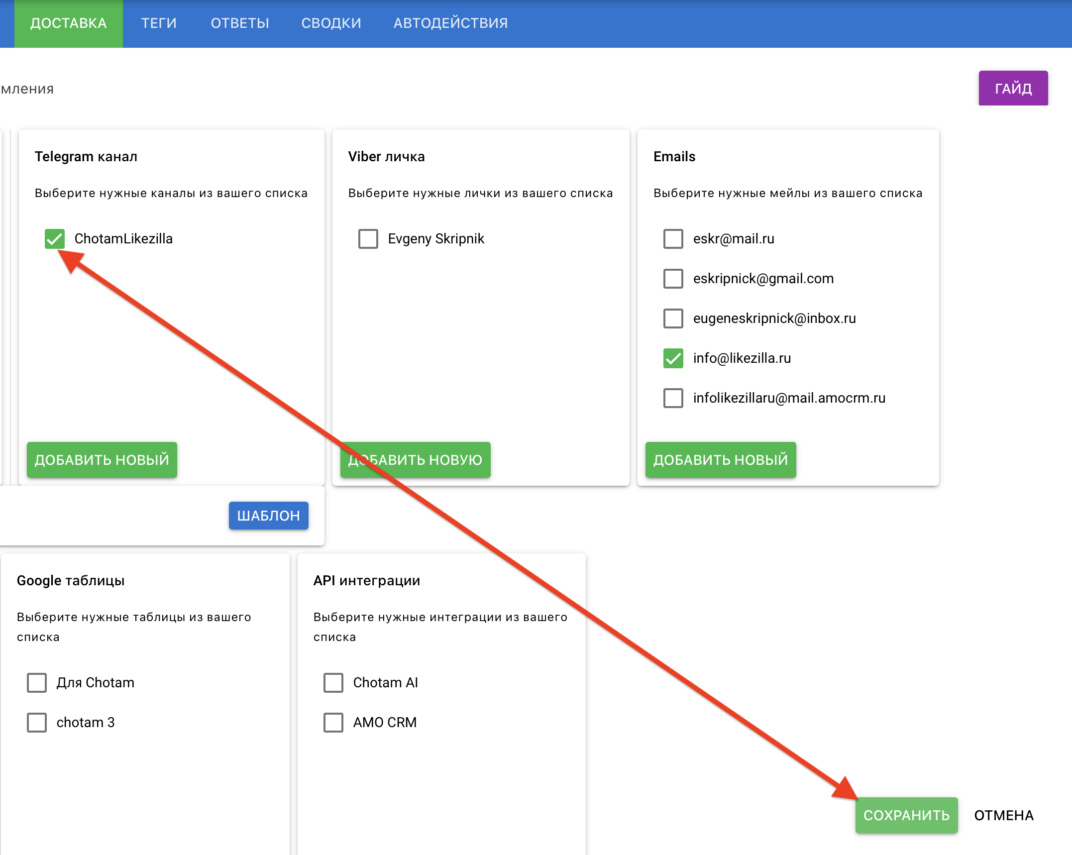 1) зайдите в настройки ваших правил на вкладку Доставка. Там вы должны увидеть зеленую галочку, стоящую напротив вашей лички телеграм, как на скрине ниже.
