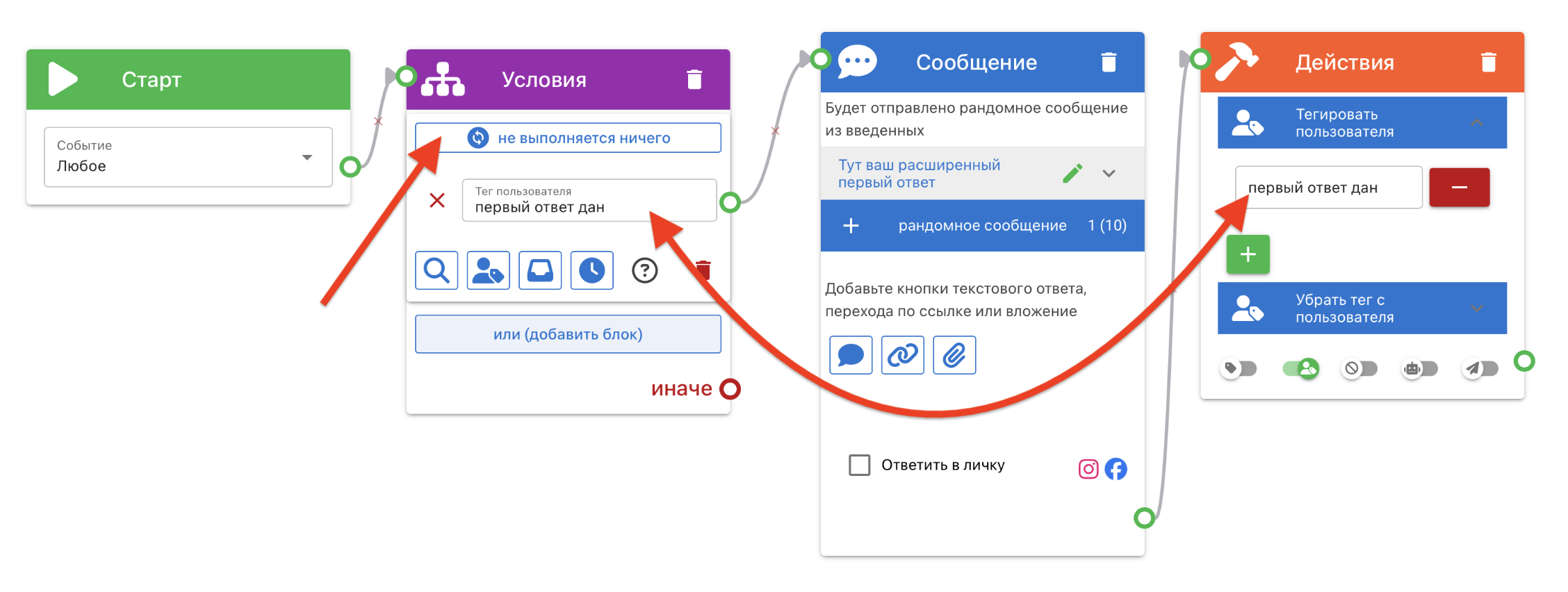 2) в модуле Условие (где делается проверка тега) и в модуле Действие (где тег ставится после того, как человек получил первое сообщение - тег должен быть прописан одинаково.