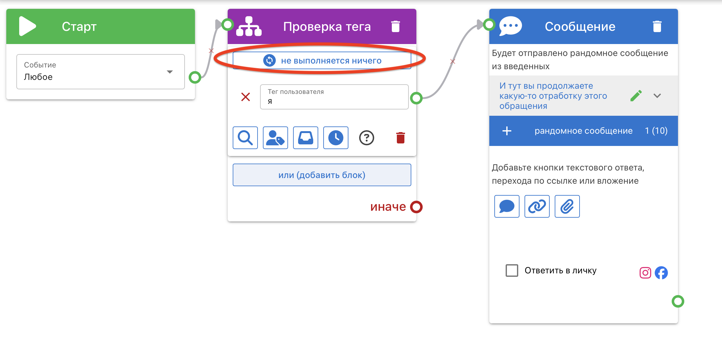 Обратите внимание, что в блоке с условием выбрано "не выполняется ничего" - это нужно как раз, чтобы автодействие продолжалось, если тега НЕТ.