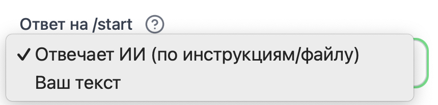 Для решения этой проблемы мы предлагаем специальный переключатель при создании ассистента - "что" будет отвечать на /start - то есть будем ли мы пересылать это в ИИ и ждать ответа, или ответим вашей заготовленной фразой.