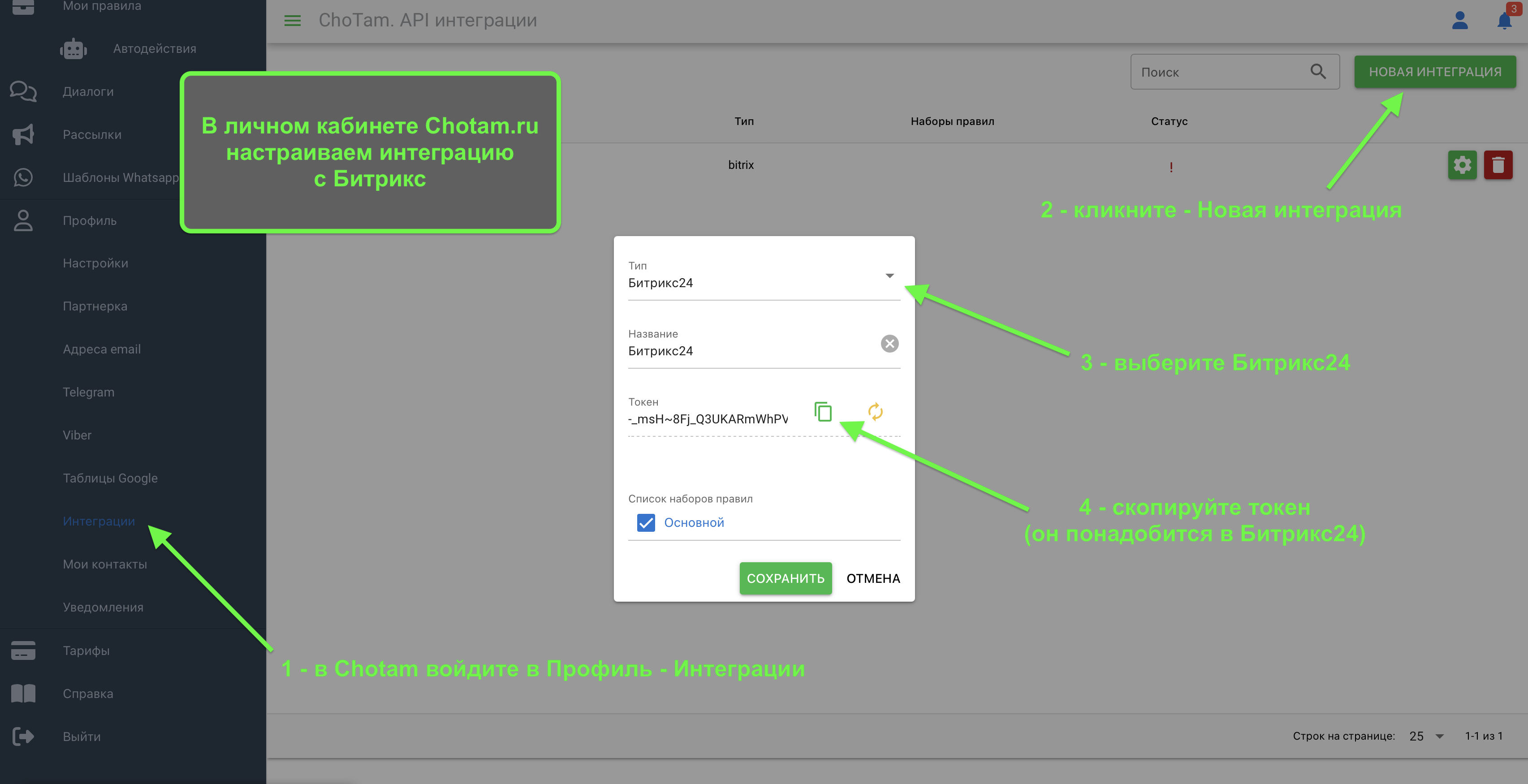 1) Создать интеграцию в Chotam (находится в вашем личном кабинете Chotam на странице Профиль - Интеграции https://app.chotam.ru/account/integrations) - скопировать оттуда токен