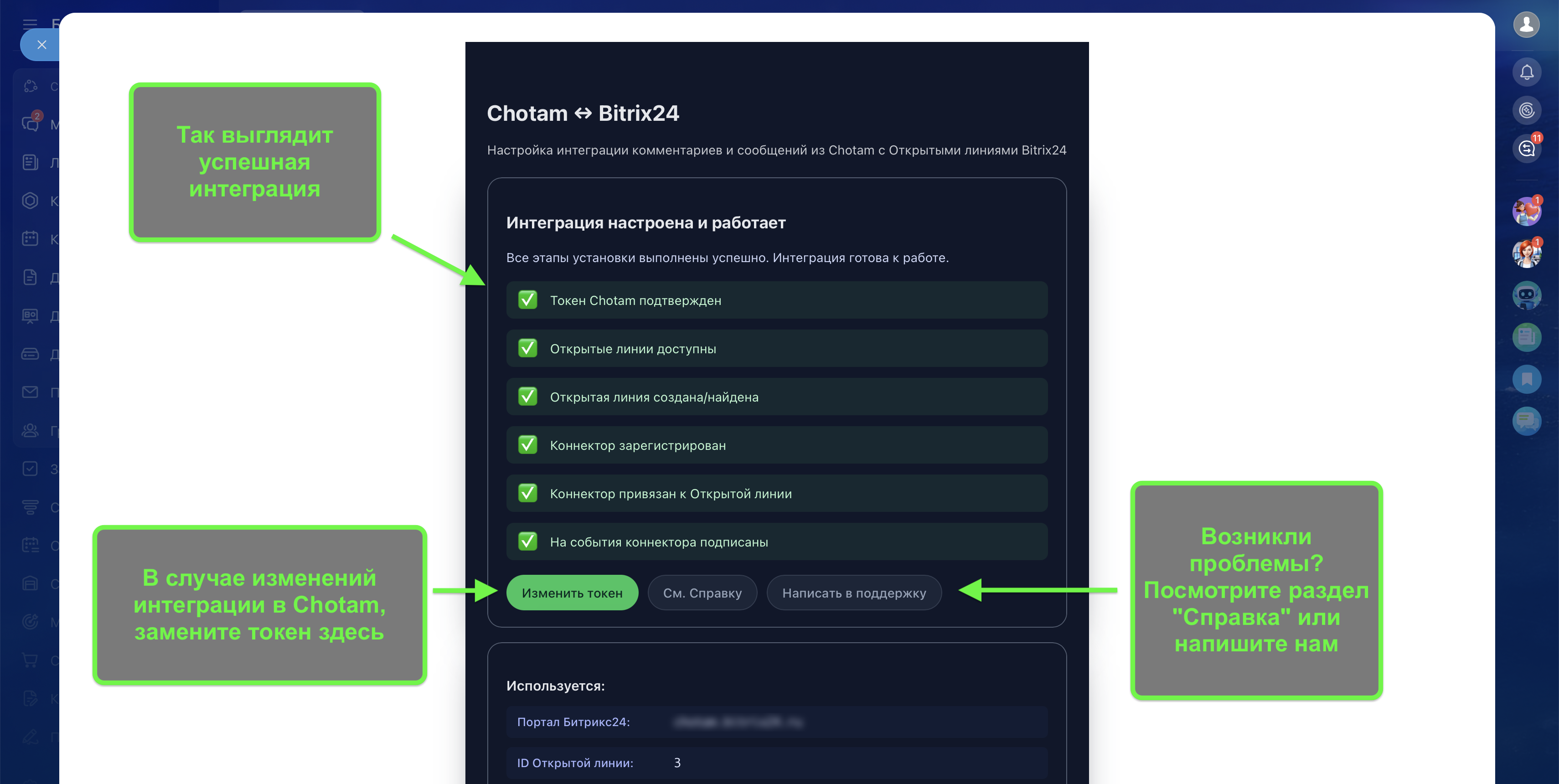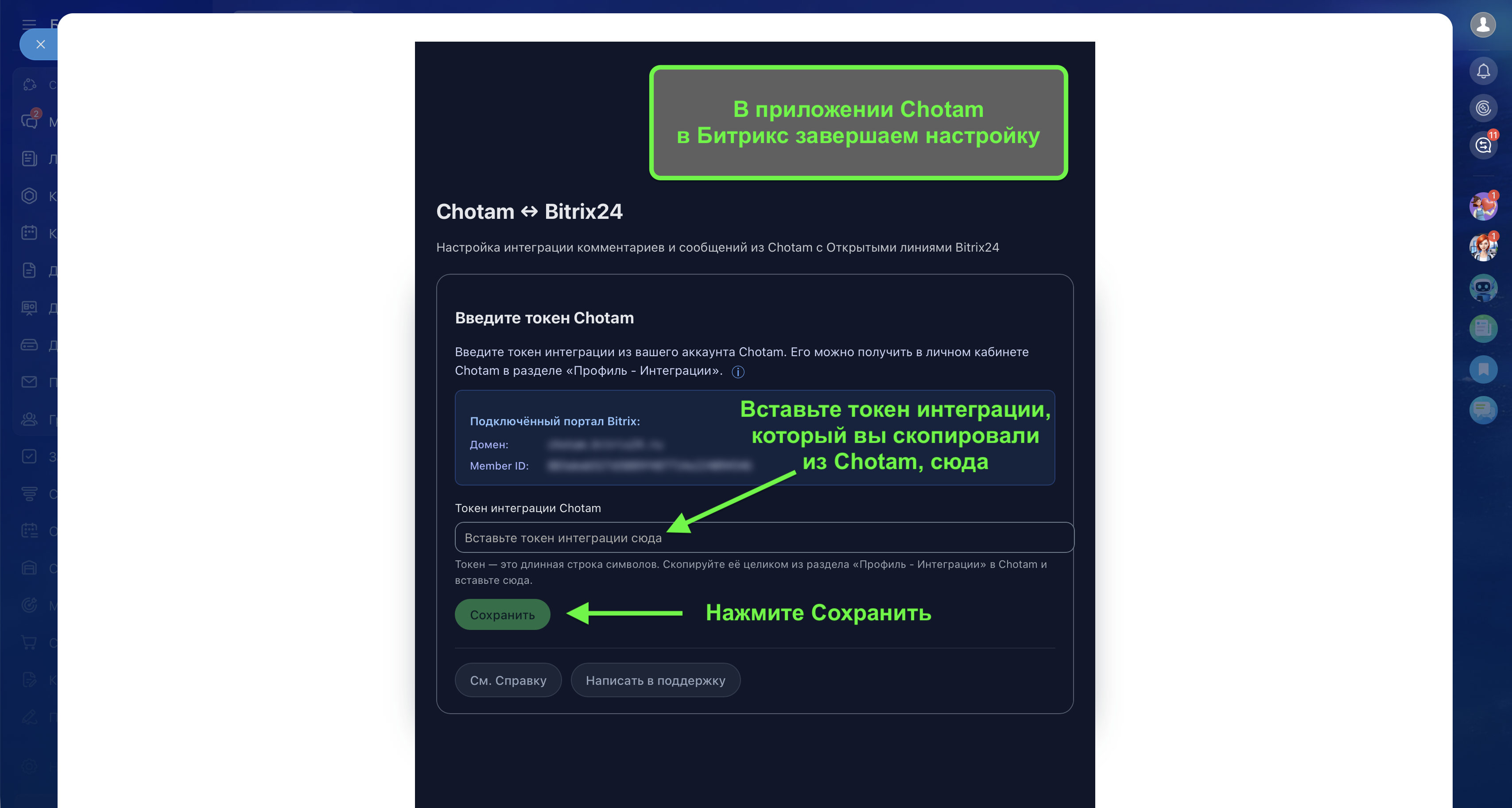 3) При подключении интеграции в Битрикс указать ваш токен интеграции с Битрикс24 из личного кабинета Chotam, который вы получили на шаге 1